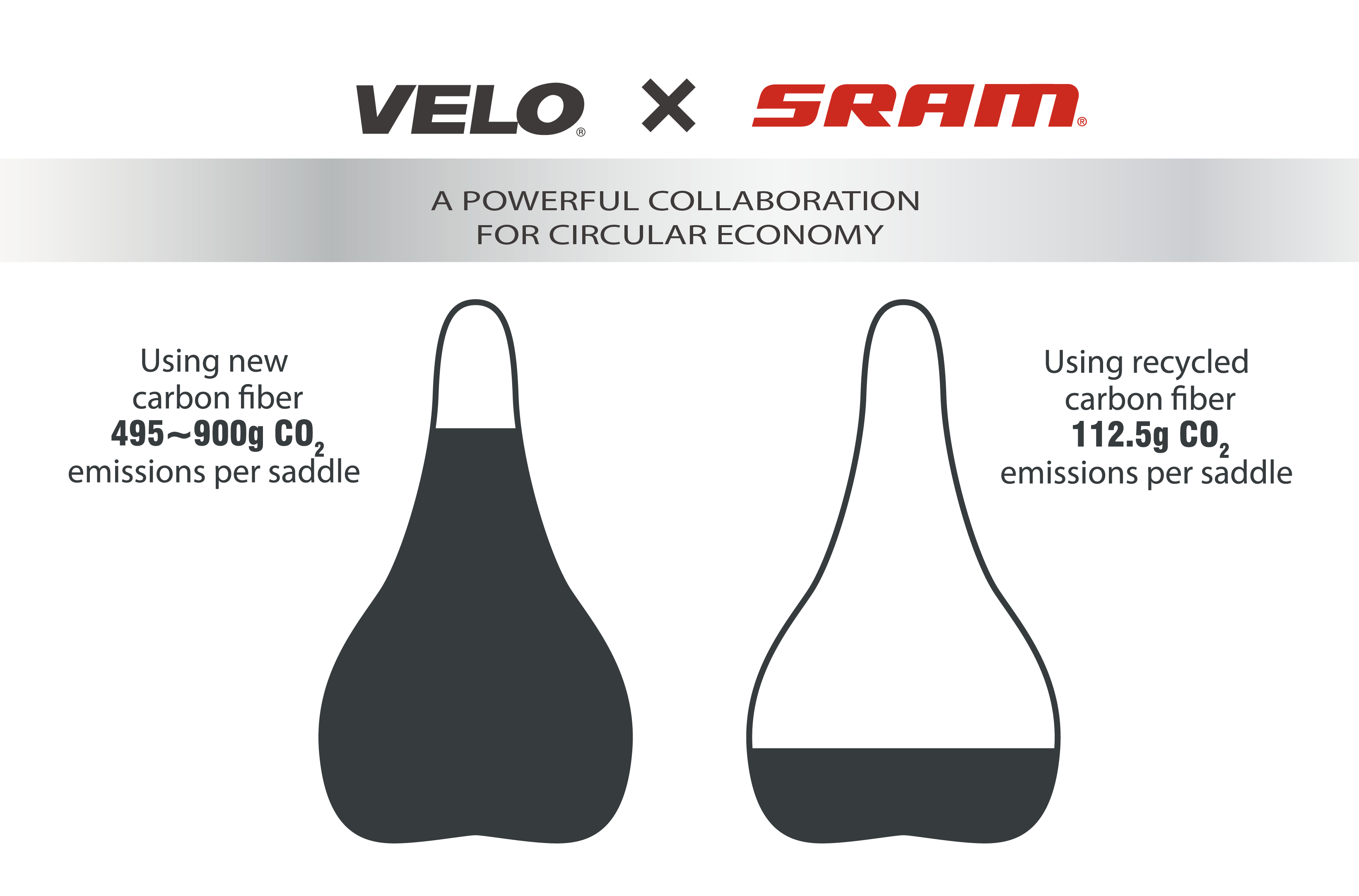 Velo與全球知名自行車零件品牌SRAM展開了一場前所未有的合作,Velo與SRAM的工廠相距不到20公里,大幅縮短供應鏈流程與運輸成本,也減少了產品的碳排放,此次雙方合作成功將回收的碳纖維餘料與尼龍結合,製造出高性能自行車座墊材料,使得原本可能掉價的碳纖維餘料仍保有同等價值。這款新材料已通過Velo嚴格的實驗室測試與驗證,確保能夠滿足生產及性能需求,並成功應用於高階座墊上。